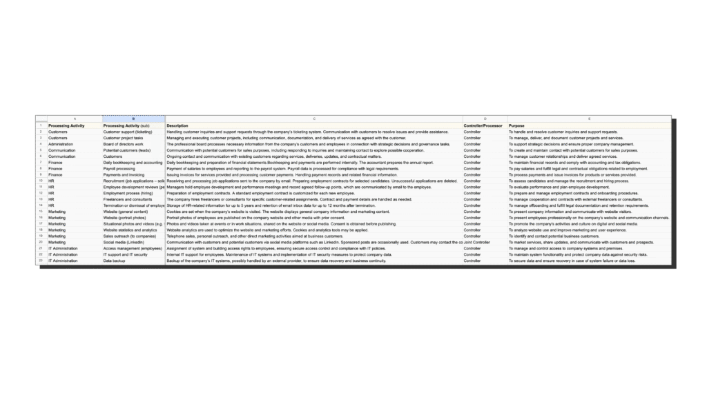 Download the file and open it in Excel or Google Sheets. Each row in the table represents one processing activity, for example, Customer support or Payroll processing.